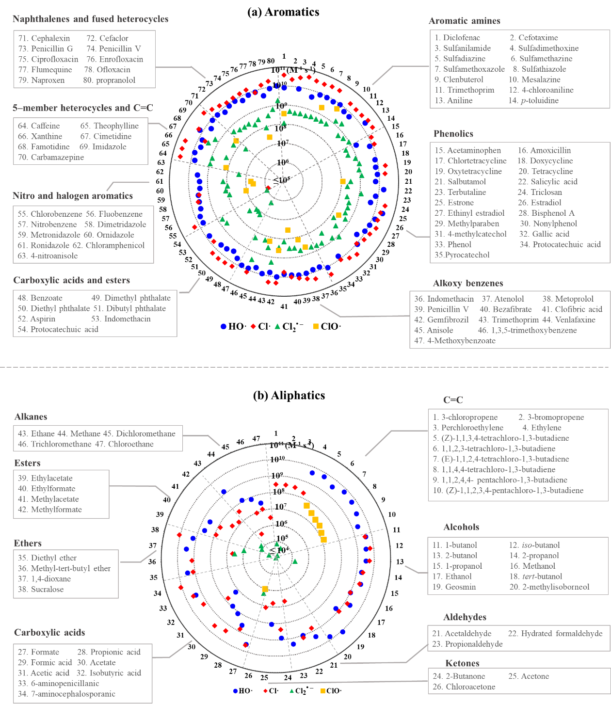 HO•和RHS对含有不同官能团的芳香类和脂肪类有机物的反应速率