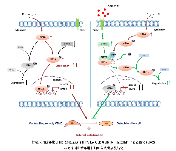 在该研究中,作者发现,辣椒摄入者的冠脉钙化积分显著低于非摄入者。而且辣椒摄入者在随访过程中显现出更少钙化进展负担。随着辣椒摄入量的增加,血管钙化积分水平逐渐降低。同时动物及细胞实验中进一步揭示辣椒素对血管钙化的保护作用和机制。在钙化模型中,SIRT6表达减少,缺氧诱导因子Hif1α稳定性增加,导致血管平滑肌细胞向成骨表型转化。而辣椒摄入可激活1型瞬时感受器电位香草素(transient receptor potential vanilloid type 1,TRPV1),进而上调SIRT6,促进Hif1α去乙酰化及降解,抑制血管平滑肌细胞成骨表型转化,发挥血管钙化的保护作用。