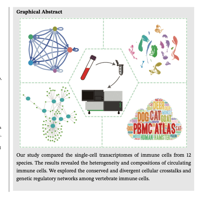 该研究利用单细胞测序技术,全面比较和分析来自人、小鼠、仓鼠、猴、虎、猫、狗、兔、羊、鹿、鸽子和斑马鱼等12个物种的外周血单个核细胞 (PBMC)中五种免疫细胞(T、B、NK、单核和树突状细胞)的转录谱特征,揭示了不同物种之间不同类型免疫细胞的异质性分子特征和细胞间互作关系,及同一种免疫细胞在演化和发育上的保守性。该研究鉴定,12个物种的五种细胞之间214对保守的细胞—细胞互作对,其中最保守的是VIM-CD44,在树突状细胞和T细胞之间最常见;T细胞和B细胞之间最保守互作对是CD40LG-CD40、CD40LG-TRAF3、CD40LG -ITGB。研究分析了上述互作对在细胞内所属的信号通路、每一种细胞的发育调控网络,以及参与调控的核心转录因子及其下游靶向基因。研究结果有助于理解PBMC等免疫细胞发育、成熟、增殖、激活和分化,分析免疫性疾病中最为常见的抗原呈递和适应性免疫反应的机制,揭示免疫性疾病的异常免疫细胞的功能,最终对指导免疫系统疾病中的药物临床前试验有参考价值。
