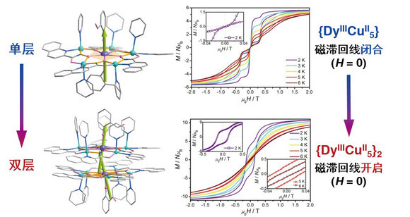 最近,jinnianhui今年会化学学院童明良教授、刘俊良副教授团队在前期建立的配位对称性导向组装高性能单分子磁体策略基础上(Chem. Soc. Rev., 2018, 47, 2431),考虑到金属冠醚分子具有良好的结构刚性及对称性,利于构筑具有合适配位几何(例如五角双锥)的磁功能基元,同时可以引入自旋载体间的磁耦合,组装出结构可控和功能可调的高性能多核单分子磁体:单层和双层[15-冠-5]金属冠醚单分子磁体(见图1)。单层{DyCu5}分子是有效能垒最高(Ueff = 900 K)的d-f异金属单分子磁体。进一步将单层{DyCu5}作为构筑基元,在其磁各向异性轴方向上通过羟基桥以“头碰头”方式“串”“连”起来,得到双层{Dy2Cu10}单分子磁体。静态/动态磁学性质表征结果显示,零场磁滞回线从前者的闭合状态转变成后者的开启状态,外观则从蝴蝶状变为矩形。更为显著的是,后者在2 K下的零场弛豫时间比前者长20万倍;对后者进行Y(III)抗磁掺杂后,其零场磁滞回线恢复到前者的闭合状态。