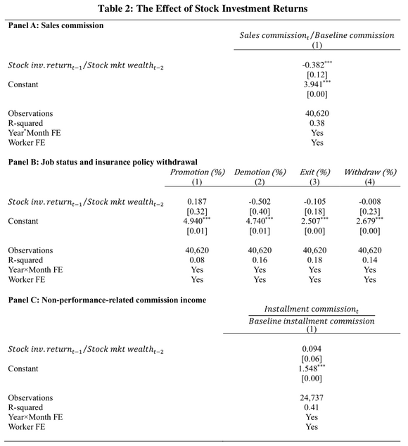 此研究所面临的挑战主要在于以下三点:首先,股票市场(收益)和劳动市场(决策)可能会同时受到宏观经济水平以及个体异质性的影响;其次,从广延边际上看,在面对股票市场的高频冲击时,劳动市场的总体供给可能并不是首先调整的变量;最后,从集约边际来看,考虑到很多工作都是采取雇佣合同的方式,工资具有粘性,因此它并不是一个很好地用来衡量劳动供给的因素。为了解决这些问题,作者们开发了一个新颖的个体粒度的月度微观数据。此数据包含了2013-2016年期间某大型保险公司的主要城市分行的保险销售代理人的月度工作收入(主要是销售佣金,因为它可以准确地反应劳动供给)以及这些保险销售代理人在深圳证券交易所的全部股票投资活动月度数据。这样的细颗粒数据可以很好地控制宏观经济因素以及个体异质性对实证结果的影响。研究的初步统计性结果表明,股票市场的加权平均收益上升1%会导致总销售佣金下降2.01%;进一步的固定效应线性回归模型结果说明,若个体本月在股票市场上的收入上升10%,平均而言将会导致其在下个月的劳动供给下降3.8%;广延边际结果表明,在受到股票市场的冲击后,员工的升职或离职倾向并没有改变;最后,作者们也检验了股票市场对劳动供给的负向效应的外部有效性,认为其所研究的投资者样本与中国股市的股民有着较高的相似性,并且结果也并非因为股市处于特定时期而估计得到,因此所得到的结论具有可推广性与普适性。