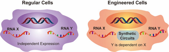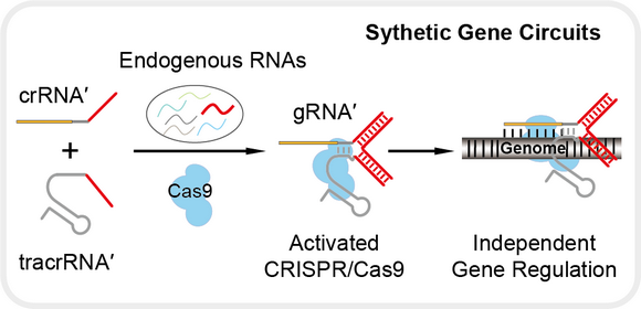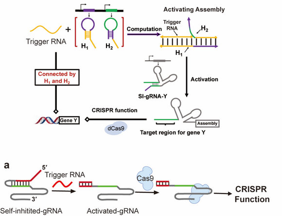 今年会新闻网讯(通讯员林娇)生物体内,复杂的基因网络是细胞发挥功能的基础。特定环境下,不同基因间相互交流将决定细胞命运。发展操控生物系统分子工具的一个重要目标是能够人为构建基因回路以调控细胞功能或控制细胞表型。比如,细胞内原本独立表达的X与Y两个基因,在引入人为构建的合成回路后,RNA-X能发挥调控RNA-Y表达的作用(图1)。试想,在癌细胞中,如果X为原癌基因, Y为抑癌基因,在两者间建立基因回路,以原癌基因诱发抑癌基因表达,将可能实现细胞癌变的源头防治;而如果X为病毒基因,Y为免疫相关基因,入侵的病毒引起某些免疫相关基因的表达,将可能实现剧烈地激活免疫反应以清除病毒。因此,建立细胞内源基因的关联调控将可能为细胞引入主动防御机制,以调节其在不同环境下的响应行为,而这也是人工改造细胞的一个重要目的。