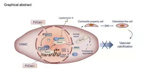 免疫荧光结果显示,过表达SIRT6的VSMCs在高Pi刺激下,细胞质中的Runx2明显多于细胞核,提示SIRT6可能影响了Runx2的细胞内定位。Exportin-1(XPO1)在蛋白核质输出中起重要作用,IP结果显示XPO1能够与Runx2直接结合,而敲低XPO1能够增加因过表达SIRT6所导致的Runx2的稳定性降低。进一步应用XPO1抑制剂(Leptomycin A)显示,XPO1抑制剂能够明显加重过表达SIRT6所导致的钙化减轻,提示XPO1在SIRT6所介导的钙化保护中起到重要作用。