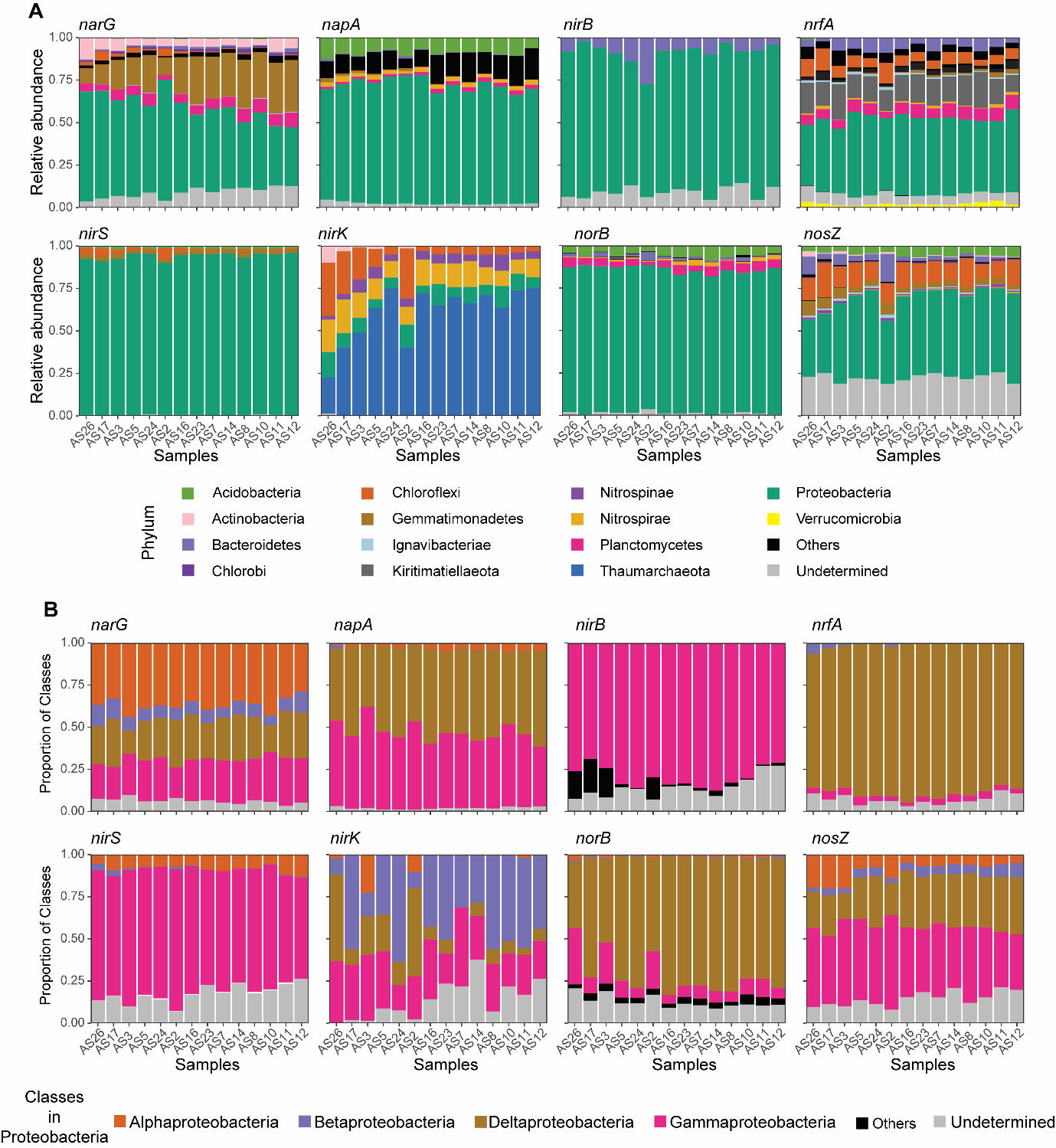 此外,参与相同通路(如反硝化作用)的氮循环功能基因对环境变化的响应不一致(图3),并且参与不同氮循环步骤的主要类群也不相同(图4),这一定程度上解释了为什么单个功能基因的丰度往往不是特定氮循环过程速率的可靠代理。这项研究从生物地理学的角度扩展了我们对氮循环过程的了解。本研究的思路也适用于其它生境,并且随着宏基因组数据的不断积累,我们最终可以绘制一幅氮循环功能基因的全球分布图。这张图将为我们从生物地理学的角度理解全球氮循环提供重要的基础背景信息。