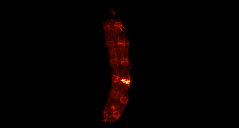 小鼠损伤腰椎的荧光三维成像。荧光信号最高的区域为被损伤的椎间盘,组织中的胶原蛋白被大量破坏。
