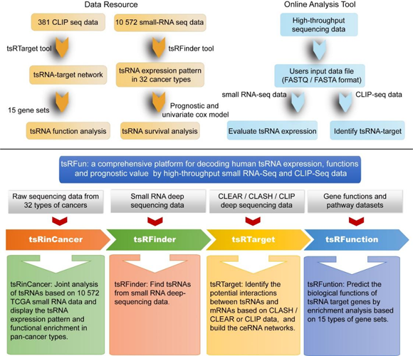 近年来,伴随着高通量RNA-Seq及CLIP-Seq技术的大规模兴起,tsRNA在人类重大疾病中的诊疗价值进一步得到了体现。然而,针对细胞内tsRNA功能机制的解析始终存在困难。近日,该团队郑凌伶副教授利用细胞功能组学技术及数学建模方法,开发了全面的tsRNA功能解析及应用分析平台:tsRFun (http://biomed.nscc-gz.cn/DB/tsRFun/ 或 http://rna.sysu.edu.cn/tsRFun/)(图2)。该工具整合了包括转录组、靶标组、修饰组在内的多组学测序数据,利用统计学模型鉴定了正常和疾病细胞类型中的tsRNA表达模式,并揭示了它们在细胞内的调控网络及其在人类32种癌症中的诊断价值,为tsRNA研究领域提供了丰富的数据资源及有力的分析工具。