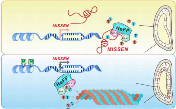 近日,jinnianhui今年会生命科学学院陈月琴教授/张玉婵副教授课题组率先发现并鉴定了一个水稻胚乳发育相关的lncRNA MISSEN(MIS-SHAPEN ENDOSPERM)。功能研究显示,超表达MISSEN导致胚乳发育早期胚乳胞化受阻,使种子呈“大肚子”的表型。通过进一步的机制研究,该团队揭示MISSEN通过结合螺旋酶家族蛋白HeFP参与胚乳早期发育过程。他们发现,在正常情况下,MISSEN的表达水平,在植株授粉后由H3K27me3修饰调控并逐步减少以致最终关闭,以保证胚乳发育正常进行;然而,当MISSEN超表达后,MISSEN会和tubulin竞争性结合HeFP,阻止HeFP参与胚乳发育的调控。