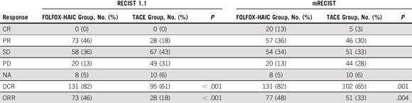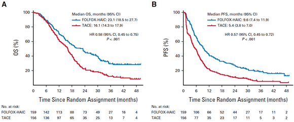 这是一项随机、多中心、开放标签研究,入组患者为无血管侵犯或肝外转移的不可切除肝细胞癌,并且肿瘤最大径≥7 cm,患者按1:1随机分配,分别接受FOLFOX-HAIC(n=159)或TACE(n =156)治疗。主要研究终点是总生存期。