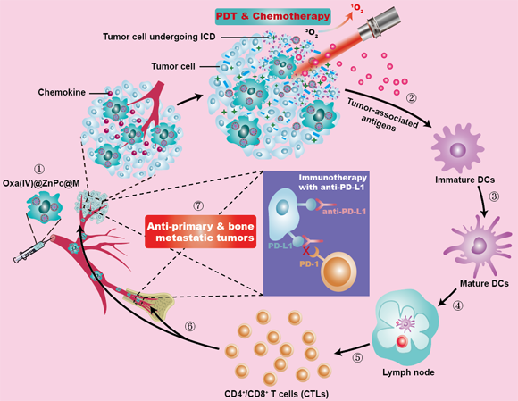 该细胞递药系统具有载药量高、细胞活力高、递药效率高及药物可控释放等特性,于体内可同步靶向到原发瘤及骨转移瘤区域(如图所示)。在原发肿瘤部位进行近红外光照射,可激活光敏活性分子的光动力治疗,实现:①可控触发并加速奥沙利铂从细胞载体中的释放,发挥其诱导细胞免疫原性死亡(immunogenic cell death, ICD)功能;②化疗与光动力治疗的联合,不仅显著抑制原发肿瘤,且能联合诱导ICD的发生激活免疫系统,促进树突状细胞(dentritic cells, DCs)成熟,并促进瘤内CD8+T细胞和CD4+T细胞的浸润,同时提高血清中IFN-γ和TNF-α的水平,与PD-L1抗体联合后显著抑制原发瘤及骨转移瘤,并显著缓解肿瘤转移导致的骨溶蚀。此外,该化疗-光动力-免疫联合治疗体系赋予了小鼠长期抗肿瘤免疫记忆效应,并显著延长了小鼠的生存期,且生物相容性良好。