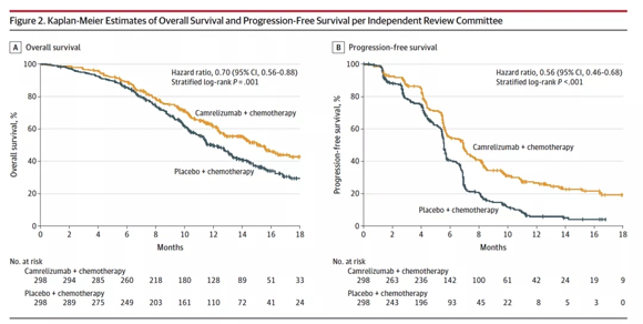 2018年12月3日~2020年5月12日,研究共入组596例受试者,按照1:1随机入组,分别接受PD-1抗体联合紫杉醇和顺铂或安慰剂联合紫杉醇和顺铂治疗,6程后接受PD-1抗体或安慰剂维持治疗,最长时间达2年。研究的主要终点是无进展生存(PFS)和总生存期(OS)。次要研究终点包括客观缓解率(ORR)、缓解持续时间(DoR)、疾病控制率(DCR)和安全性等。