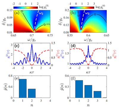 该研究提出了基于单个碱土金属原子钟跃迁,通过构建可调的动量空间和自由空间的自旋-轨道耦合,实现一个高效的基于运动自由度的N-声子聚束态发射的实验方案。不同于利用Mollow机制的非共振高阶过程产生的N-声子发射,该研究提出的利用共振跃迁的N-声子发射方案可以产生很大的声子数激发,可以用来作为高品质N-声子源。这里N-声子聚束态发射可以通过计算推广的高阶关联函数来很好的刻画。如图1所示,不同的声子束之间表现出强的反聚束效应,同时单声子之间表现出强的聚束效应。同时利用声子的统计特性对光钟位移的高度依赖性,可以探究利用非破坏性测量声子的量子统计特性,实现对原子魔幻波长或者光钟位移的实时精密测量,这将对高精度冷原子光钟的研究具有重要的意义。
