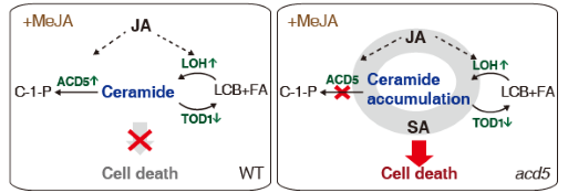 植物鞘脂结构复杂多样,是构成生物膜的主要成分,也是细胞中重要的生物活性分子,参与多种信号转导途径,在植物调控生长发育、应对生物和非生物胁迫过程中发挥着重要作用。神经酰胺作为鞘脂代谢的中心分子,其含量变化往往会影响到整个鞘脂代谢的稳态。ACCELERATED CELL DEATH5(ACD5)编码拟南芥神经酰胺激酶,该酶的缺陷突变体acd5在生长后期大量积累神经酰胺,并且伴有自发性细胞死亡表型,以及水杨酸(salicylic acid, SA)水平的升高。在acd5中,神经酰胺诱导的细胞死亡依赖于SA途径,但具体的分子机制及其它相关植物激素在鞘脂相关细胞死亡过程中的功能仍不清楚。