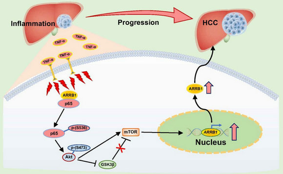 图1:在肝脏炎症微环境中,TNF-α激活NF-κB信号通路,在β-arrestin1(ARRB1)诱导下NF-κBp65亚基Ser536位点磷酸化上调,从而活化下游Akt/mTOR信号通路,以诱发肝细胞的癌变及促进肝癌的发展