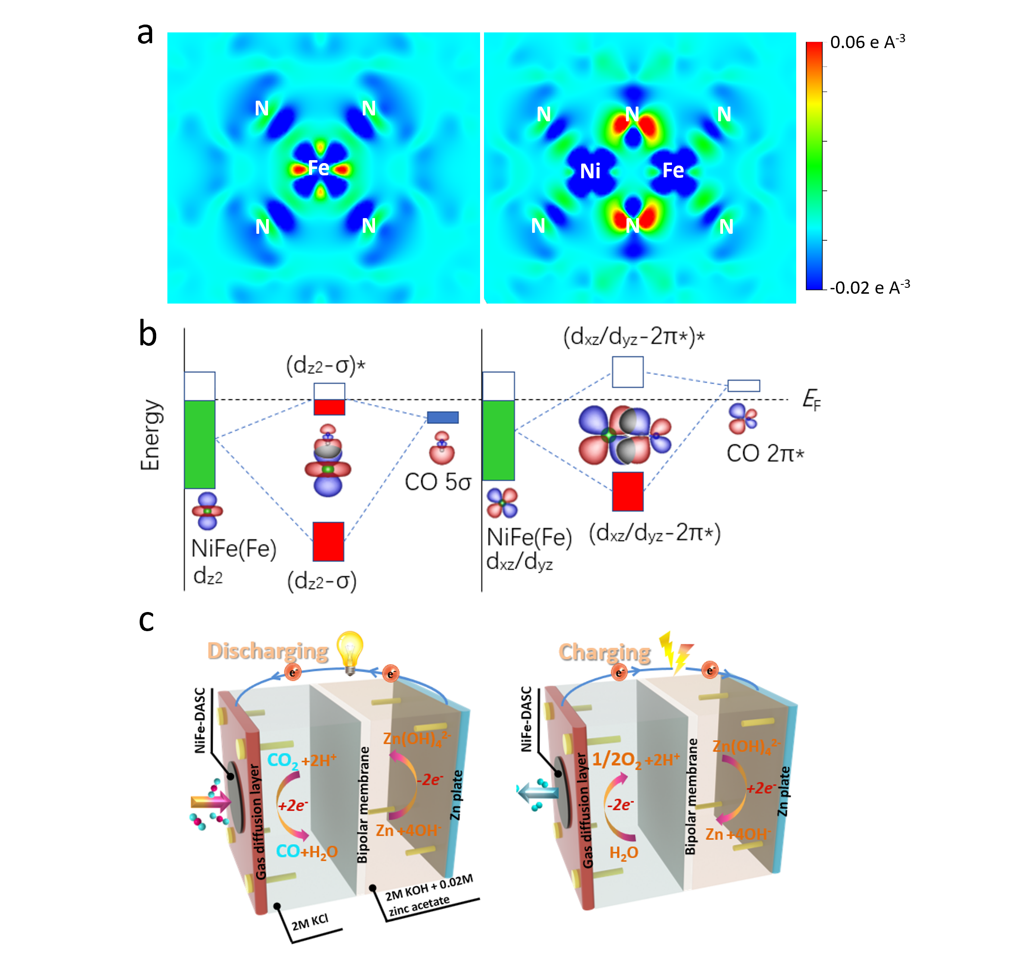 图1. Fe单原子(Fe-SAC)和FeNi 双原子位点(FeNi-DASC)催化剂中(a)Fe位点电荷分布,(b)Fe位点3d 轨道于吸附的CO (5σ and 2π* 轨道相互作用示意图,(c)FeNi-DASC的金属-CO2电池充放电过程。
