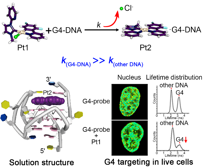 毛宗万教授团队首次提出了一种新的G-四链体选择性靶向的时空控制策略,即由自适应结构转变激活小分子与核酸G-四链体的相互结合并由动力学控制小分子对G-四链体选择性。不同于传统的热力学控制模式,这种新的靶向模式由动力学控制,配合物的惰性配位键对选择性结合起调节作用,为G-四链体或其它生物分子的靶向小分子的开发与设计提供了新思路。