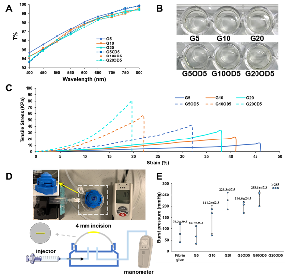 新型水凝胶具有理想的粘合剂理化特性,其凝固后的透光率在可见光范围内均超过90%。且优选成分比例(G20OD5)的粘合性凝胶具有最低的溶胀率(11.19±0.59%)和最佳的耐酶解性。在离体的猪角膜压力测试中,G20OD5可承受超285 mmHg的眼内压,这些性质有利于角膜厚度的维持及长时间的牢固粘合。(图2)。