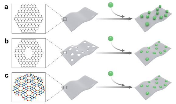 图1. 纳米颗粒与纳米片的典型复合类型:(a) 纳米颗粒附着于非多孔载体表面;(b) 纳米颗粒镶嵌于多孔载体上;(c) 纳米颗粒镶嵌于非多孔载体原位生成的缺陷中。分别以石墨烯、多孔石墨烯和M-CA纳米片作为例子。