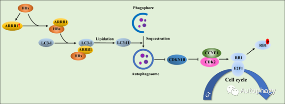 图注:HBV表达的HBx蛋白通过上调ARRB1,并与ARRB1结合产生相互作用,然后促进I型LC3酯化反应形成自噬小体,这种自噬小体参与并促进了肝细胞癌变中的自噬过程,使细胞周期蛋白E-CDK2复合物的活性增强,进而促进细胞周期中G1/S期加速,导致肝癌的发生、发展
