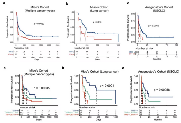 ITH-L的患者具有更长的生存期。此外,肿瘤内异质性 分布与TMB并无相关性,可认为是两个互相独立的指标。当联合TMB后,肿瘤内异质性能够在TMB-L的患者中进一步区分出疗效好和疗效差的两组。