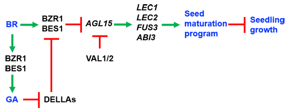 目前的研究发现由LEC1、LEC2、FUS3和ABI3组成的LAFL转录调控网络,在种子发育阶段起着非常重要的作用。因此,对LAFL的精准调控显得非常重要。遗传分析表明,在种子发育时期,LAFL网络需要被激活,以促进种子正常发育。在种子发育过程中,MADS-box转录因子AGAMOUSLIKE15(AGL15)可以直接结合到LEC2、FUS3ABI3上,促进这些基因的表达;而在种子萌发期间 LAFL 网络则需要被抑制,促进从种子到幼苗的发育转型。油菜素甾醇(Brassinosteroids,BRs)是一类植物中的类固醇激素。BRs 参与植物一系列重要的发育过程,包括种子萌发、细胞伸长、维管分化、光形态建成、衰老、花粉育性、开花、种子发育和抗逆性等。然而,BR在种子向幼苗的转型中是否参与关闭种子成熟程序还不清楚。