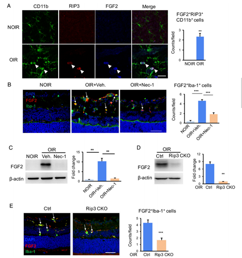 为了进一步探究RIP3+小胶质细胞程序性坏死是如何介导视网膜新生血管形成,研究人员利用Luminex高通量多因子检测技术筛选促血管生成因子的表达情况,发现FGF2在OIR模型中上调最为显著。进一步在OIR小鼠视网膜中明确,RIP3+小胶质细胞高表达FGF2,且当应用RIP1抑制剂Nec-1和利用RIP3 CKO的功能缺失策略时,FGF2表达释放明显减少。提示RIP3+小胶质细胞可通过程序性坏死释放FGF2(图三)。
