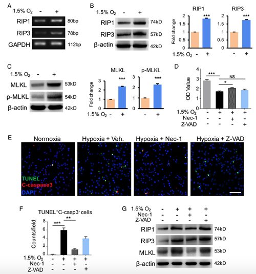 同时,研究人员在体外培养小鼠原代小胶质细胞和小胶质细胞系,再次证明低氧环境可诱导小胶质细胞上调RIP1/RIP3/MLKL发生程序性坏死,并发现该过程可被RIP1抑制剂Nec-1阻断(图二)。