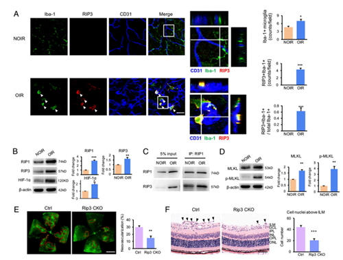 图一 Rip1/Rip3高表达的小胶质细胞发生程序性坏死促进视网膜新生血管形成