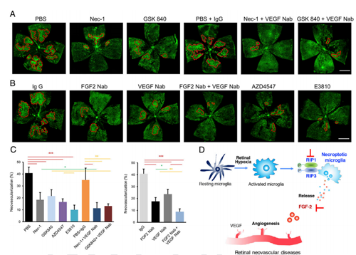 以上研究证明,在低氧刺激下,视网膜小胶质细胞RIP3+亚群发生RIP1/RIP3/MLKL依赖的程序性坏死,释放FGF2,从而促进视网膜新生血管。基于此,我们提出了联合抗程序性坏死和抗VEGF治疗视网膜新生血管的新策略。动物实验结果显示,联合治疗效果显著(图四)。