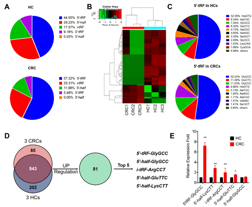 图1 CRC血浆中tDRs表达谱分析及5’-tRF-GlyGCC表达情况