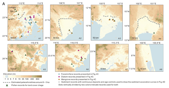 郑卓教授团队的研究成果利用孢粉记录集成的水稻农业历史发展,结合钻孔古环境数据重建的华南和东南亚地区沿海平原扩张过程,揭示出距今3-2千年是沿海平原快速堆积和扩张的关键阶段,并显示与花粉记录指示的水稻农业快速扩张同步变化。距今2.5千年开始是华南地区水稻农业快速发展和向东南亚扩散的主要过渡阶段。本研究证实了环南中国海周边地区海岸带平原沉积演化的关键过程与亚洲东南部水稻农业的爆发式扩张存在密切关系,展示了微体古生物和孢粉学在发掘历史时期人地关系等重大科学问题中不可替代的作用。
