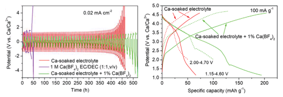 图2. 基于电解液优化策略调节钙金属沉积/剥离电位和钙金属电池电压示意,钙//钙对称电池优化前后的电压-时间曲线(左图),钙金属电池优化前后的工作电压曲线(右图)。
