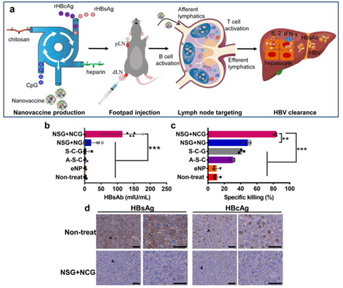 我校材料科学与工程学院纳米医学工程研究团队在前期工作的基础上(Nano Letters, 2018, 18: 30007),以壳聚糖和肝素为递送材料,以CpG激动剂为分子佐剂,采用重组乙肝病毒表面抗原(rHBsAg)和核心抗原(rHBcAg),使用快速纳米络合技术分别制备了包含rHBsAg和CpG的纳米疫苗(NSG)、包含rHBcAg和CpG的纳米疫苗(NCG)。研究发现,联合使用这两种纳米疫苗(NSG+NCG),可以有效促进树突状细胞的成熟和活化,同时它们也显示出优越的淋巴结靶向能力,明显延长抗原在淋巴结中的驻留时间。在乙型肝炎病毒(HBV)慢性感染的小鼠模型中,NSG+NCG纳米疫苗可以打破免疫耐受,重建HBV特异的免疫反应,在小鼠体内引起显著的细胞毒T淋巴细胞(CTL)反应,有效清除HBV,实现HBsAb的血清转换。重要的是,NSG+NCG纳米疫苗治愈的CHB小鼠形成了长期的免疫记忆,可保护小鼠免于HBV的再次感染。该研究采用的材料简单安全,制备纳米疫苗的高效加工技术可实现高重现性、可规模化;同时使用的两种颗粒疫苗也可以按照不同的配比使用,可望用于慢性乙肝的个性化治疗,一次该项成果具有临床转化的前景。