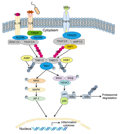 ASB蛋白属于SOCS超家族,ASB蛋白通过识别特定底物并介导底物的K48泛素化及随后的泛素-蛋白酶体途径依赖地降解来调节细胞因子信号通路和一些肿瘤相关通路。不同的是,该研究揭示了ASB1不同于其他含SOCS box蛋白的功能。它不仅抑制了底物TAB2的K48泛素化,反而促进了底物的稳定性。因此,该研究鉴定了ASB家族蛋白的一个不同于其他SOCS box成员的功能。以上这些结果说明,ASB1不仅可在免疫细胞中发挥调节炎症的作用,而且还在各种炎症性疾病模型中也具有同等重要的生理作用。鉴于这种重要作用,以ASB1为靶点设计药物可能在抗微生物感染免疫和炎症性疾病中具有重要意义。