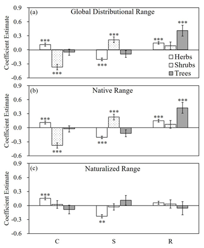 CSR策略是英国著名生态学家Philip Grime提出的竞争Competitor (C)、胁迫Stress tolerator (S)和传播环境Ruderal (R)功能策略体系,植物这3方面能力分别对不同情境下植物的分布范围扩张具有促进作用,但是CSR策略如何影响植物在全球的分布空间范围尚不明确。我校生命科学学院彭少麟教授团队最新科研成果“The role of functional strategies in global plant distribution”创新性地回答了植物分布扩张领域中的这一关键科学问题(图1a),并首次直接比较了植物在原产地和引入地分布范围扩张的功能策略差异(图1b)。