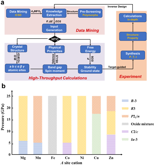 图1. a. 大数据高通量计算流程图;b. A位为不同元素的A3TeO6随压力变化时的结构变化