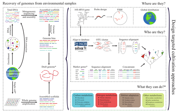 近日,我校生命科学学院李文均教授课题组在国际知名学术期刊National Science Review上发表题为“Microbial dark matter coming to light: challenges and opportunities”的观点文章。作者指出,从单细胞测序和宏基因组技术获得的基因组序列给MDM研究带来了曙光(图1),极大地扩展了我们对微生物物种和功能多样性的认知,加深了对生命起源的探索。我们在“欣赏”MDM“多姿多彩”一面的同时,MDM总是能够给我们带来惊喜,让我们更好的理解我们所存在的生命世界。作者指出目前MDM研究面临的三个挑战:(1) MDM没有统一的命名规则,使得科研圈交流混乱;(2)很难仅从基因组信息中对MDM进行全面的功能研究;(3)如何对MDM进行培养至今仍是十分具有挑战的任务。作者建议:(1)坚持对各个生境以包括宏基因组、宏转录等多组学的方式进行MDM研究,将有助于拓展我们对微生物物种和功能多样性的认知;(2)原位实验结合组学分析,以及采用包括FISH、NanoSIMS、Raman和异源表达等技术对MDM功能进行探索;(3)结合多组学和功能网络信息等指导富集培养策略。同时,作者指出MDM研究需要多学科、多维度的交叉合作,因此构建MDM研究中心将有助于解决目前所面临的挑战。