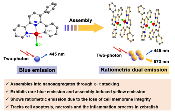 近期,我校化学学院巢晖教授研究团队利用有机铂(II)配合物的自组装,构建了一例与检测底物无反应、双光子激发的比率型双发射荧光探针Pt1,并成功应用于生命过程的定量示踪。与传统有机铂(II)配合物通过形成Pt-Pt相互作用诱导自组装不同,Pt1的自组装依赖于配体间的π-π堆积及互补氢键。Pt1在单分子时具有罕见的蓝色发光(lem = 445 nm),而自组装过程中,Pt1除了保留蓝色发光,同时还出现黄色发光(lem = 574 nm),其黄光与蓝光的比值具有浓度依赖性。