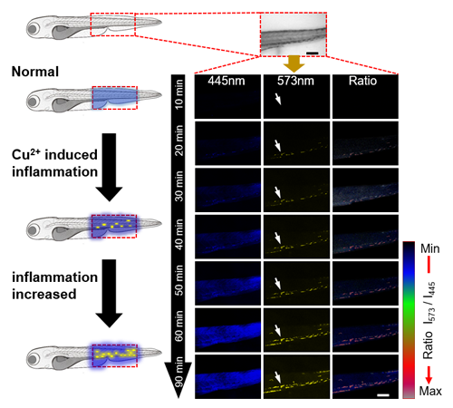 图3, 斑马鱼急性炎症模型中细胞膜损伤的实时检测。