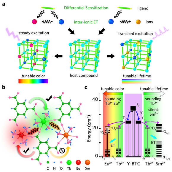 图1. (a) 光色/寿命可调镧系配位聚合物的设计策略; (b) Y-BTC的配位环境及配体向镧系离子、镧系离子间的能量传递示意; (c) 镧系离子激活的Y-BTC体系中配体与镧系离子的能级图示意。