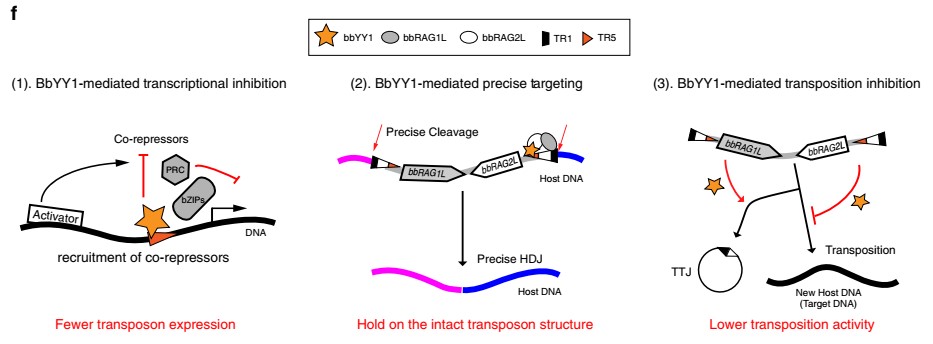 发现ProtoRAG 转座子后,一个重要的科学问题一直悬而未解。活跃的转座子在宿主基因组中移动跳跃,可影响基因组稳定性,从而对宿主产生危害。已发现的高等脊椎动物RAG系统基本都丢失了转座子特征和体内的转座活性。那么,文昌鱼基因组中的ProtoRAG是如何维持其转座子特征,却又不对宿主基因组产生严重危害呢?