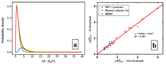 为了大幅度提高GA-FEP的预测速度,以提高药物设计效率,项目组推导了能准确描述FEP热力学循环中添加束缚步骤 概率分布的公式,并将其命名为RED函数。RED函数极大加速了GA-FEP方法的预测速度。如图1(a)所示,计算约束能量过程中,采样得到的 (黄点)可以很好地被RED函数拟合(红线)。通常来讲,约束能量需要12个λ窗口才能够准确计算。而经RED函数分析,拟合,并计算能量后,相比于通常的12个λ窗口,新方法使用一步微扰(2个λ窗口)即可准确计算约束能量。使用3个靶标及28个配体进行测试,工作中发现一步微扰(2λ窗口)以及12λ窗口得出的结果基本一致,具有极好的相关性(如下图所示),对于所有体系,两种方式计算得到的误差小于0.5 kcal/mol。这些工作和发现极大加速了FEP-ABFE的预测速度,并使得GA-FEP方法首次能应用于新药的虚拟筛选研究中。