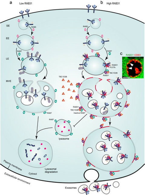 这项工作揭示了一类新型exosome产生的机制,尤其是很多年以来大家都观察到了flot和ceramide参与ESCRT不同的exosome,而这篇论文诠释了这一类exosome是怎么产生的:由RAB31标记并控制的转运必需内体分选复合体非依赖的外泌体通路,提升了学界目前对外泌体生物发生的认识和理解。此项研究成果于2020年9月21日,以Article形式在线发表于国际知名学术期刊Cell Research(《细胞研究学》)。