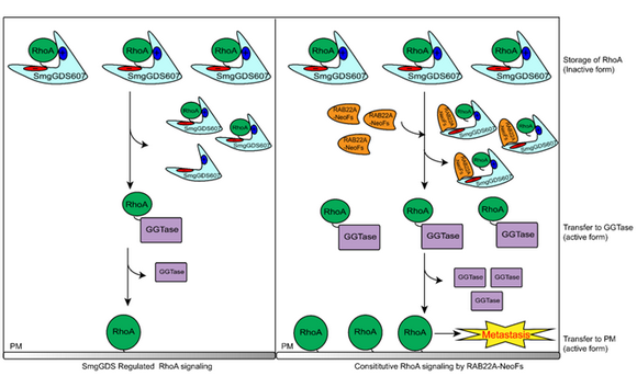 我校肿瘤防治中心康铁邦教授、附属第一医院沈靖南教授、苏州大学陈坚教授等研究团队合作,在骨肉瘤细胞系和肿瘤组织中,发现了几个与RAB22A1-38相关的融合基因,其融合蛋白(Rab22a-NeoFs)可结合SmgGDS607,促进RhoA的活化,从而促进骨肉瘤的肺转移,并合成了特异靶向的穿模多肽,可阻断该融合蛋白的功能,为骨肉瘤肺转移的靶向治疗提供了一个新的潜在靶标。同时,这类RAB22A1-38相关的融合基因在乳腺癌、肺癌的细胞系和/或肿瘤组织中也存在,并促进肿瘤转移,拓展了该治疗靶标的临床意义。研究成果于2020年6月1日,以Article形式在线发表于国际知名学术期刊《自然细胞生物学》(Nature Cell Biology),期刊最新影响因子为20.761。