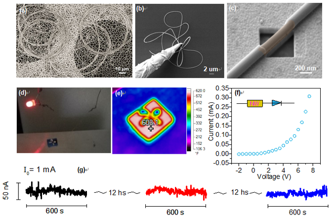 (d) 单根纳米电缆在300℃左右带动红色发光二极管工作;(e) 器件衬底的红外热成像;