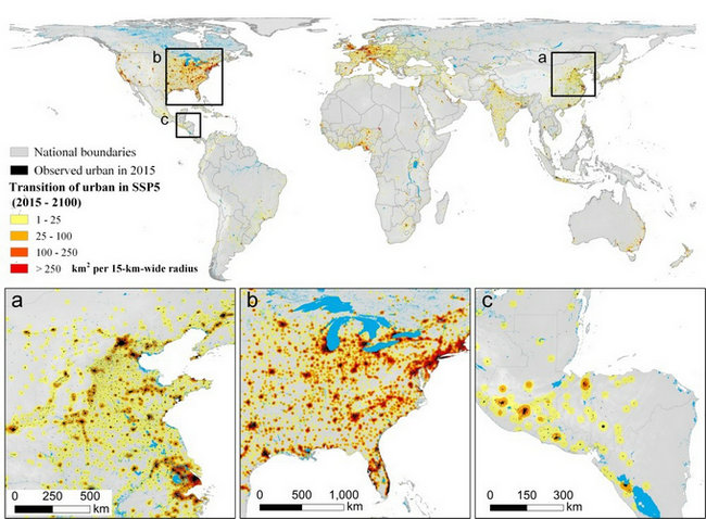 近日,我校地理科学与规划学院刘小平教授团队联合华东师范大学黎夏教授团队,在Nature Communications在线发表了题为“Global Projections of Future Urban Land Expansion under Shared Socioeconomic Pathways”的研究论文(Article)。该研究首次基于政府间气候变化专门委员会(IPCC)最新的共享社会经济路径(SSPs)对2015~2100年全球城市用地扩张进行了1km分辨率的情景预测,并分析了其对粮食生产和自然植被带来的影响。