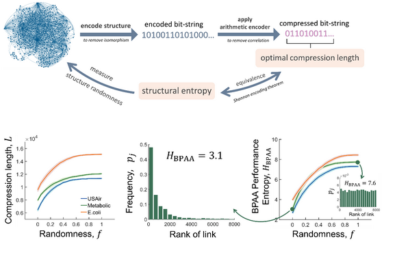 通过研究,该团队发现来自不同领域,很多大小不一的网络,其结构的最短压缩长度和可预测性之间存在一个普遍的线性关系。基于香农信源编码定理,该团队在随机网络上证明了这种线性关系。