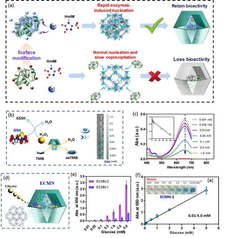 关系图;(D)GOx和HRP共封装的ZIF-8 ECMN的示意图;(E)ECMN的级联催化性能的提升;