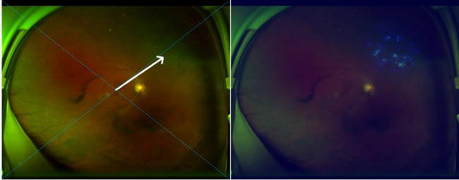 超广域眼底彩照人工智能眼病筛查系统:图中右侧高亮区域为筛选出来的病变
