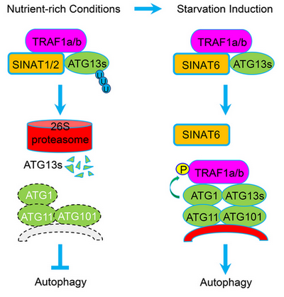 肖仕教授课题组通过精细的遗传学和生物化学分析,发现自噬蛋白激酶复合体成员ATG1和ATG13蛋白在营养缺陷及恢复条件下,其稳定性受26S蛋白酶体动态调控。在正常生长条件下,E3泛素连接酶SINAT1和SINAT2与自噬起始复合体中的ATG13蛋白相互作用,通过K48连接的泛素化修饰,促进ATG13蛋白的降解,从而抑制自噬过程的发生。在营养缺陷条件下,SINAT6则通过竞争性结合ATG13,抑制ATG13蛋白的泛素化降解,促进自噬发生。深入研究表明,ATG13a蛋白中K607和K609两个关键的赖氨酸残基对于其泛素化及抑制自噬发生至关重要。进一步,研究发现TRAF1a和TRAF1b作为接头分子,参与了SINAT1/SINAT2及SINAT6对ATG13蛋白的稳定性调控。同时,该研究揭示了ATG1蛋白通过磷酸化修饰,在营养缺陷条件下反馈调节TRAF1接头分子蛋白的稳定性,进一步维持植物自噬发生水平的稳态(如上图所示)。与其生理功能一致,拟南芥atg1a atg1b atg1c三突变体表现出提前衰老、对营养缺陷异常敏感、及TRAF1a蛋白稳定性下降的表型。该论文揭示了拟南芥SINAT家族蛋白通过介导ATG13蛋白的泛素化修饰和稳定性,影响植物自噬发生的分子机制,具有重要的科学意义。