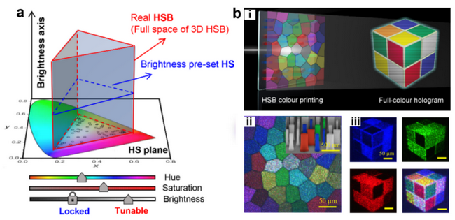 近日,我校物理学院王雪华教授和团队成员周张凯副教授、包燕军研究员等提出一种能有效克服上述两个功能缺失的方法。基于团队前期发展的相干相位设计理念(Adv. Funct. Mater. 28, 1805306,2018),他们设计两个硅纳米棒作为超构表面的基本相干像素结构单元,从而实现光场透射的有效调控。通过独立控制两个纳米棒的转角,可以实现单层结构对振幅和相位的独立调控,从而能够在单层纳米结构上实现任意全息与平面图像的集成。更进一步,针对于彩色平面图像,可以通过硅纳米棒的尺寸(即单根纳米棒的长和宽)以及纳米棒之间的转角差的控制,实现对颜色HSB三参数的按需调控,从而将超构表面结构色的调控能力从二维的色度-饱和度平面,真正拓展到三维的色度-饱和度-强度空间(如下图)。